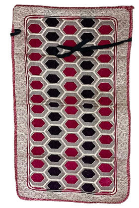 - Hexagonal patterned pouch with red, black, and gray colors on a white background.